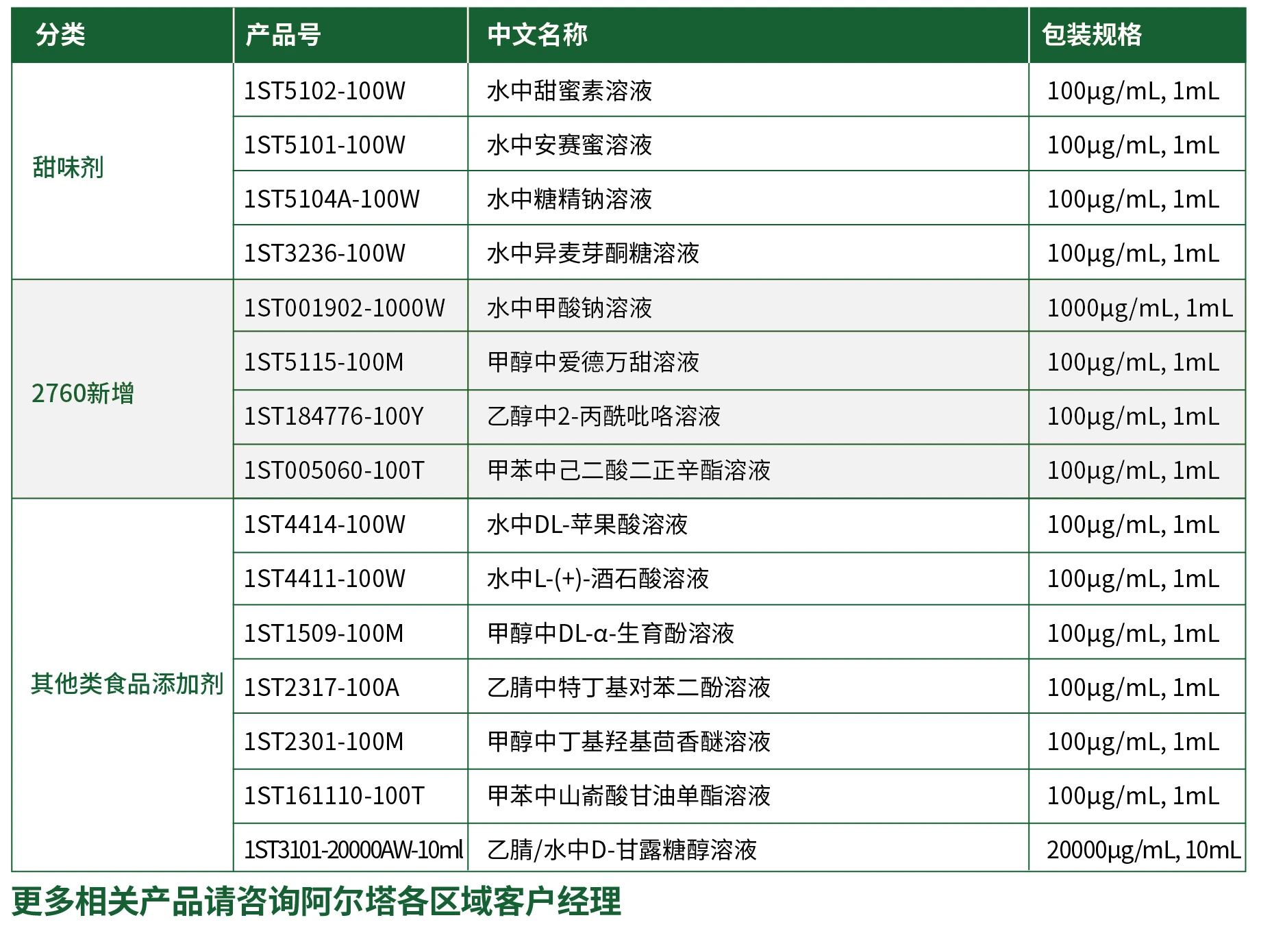 阿爾塔科技作為CNAS認可的國產(chǎn)標準物質(zhì)生產(chǎn)者,結合國家及行業(yè)相關(guān)檢測標準,推出食品添加劑檢測標準物質(zhì)解決方案,為保障食品安全提供技術(shù)支撐,推動(dòng)食品工業(yè)的持續發(fā)展。